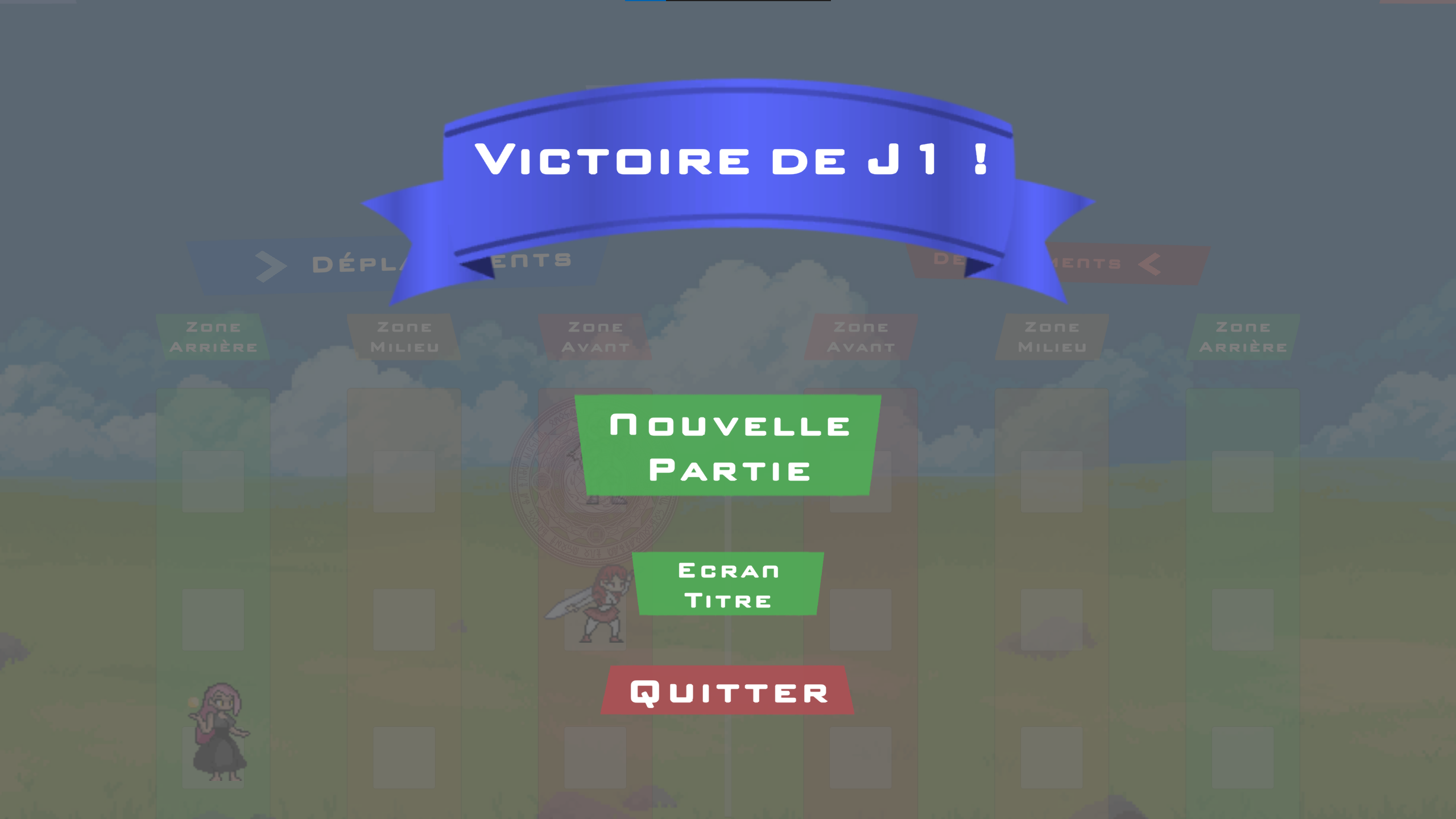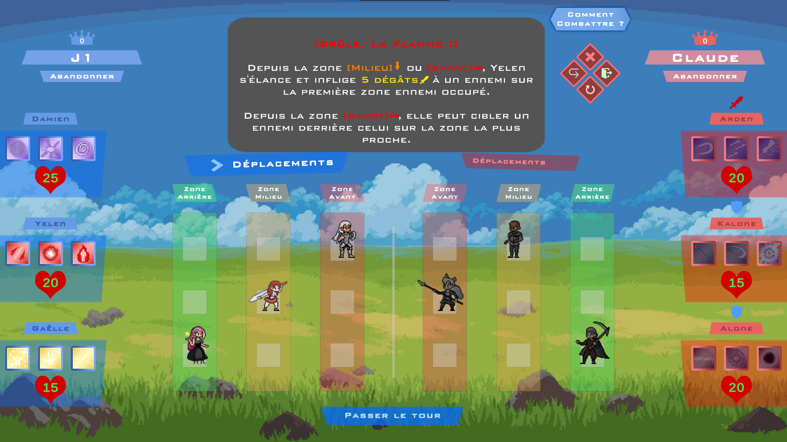 - (The gameplay aims to translate action based mechanics found in fighting games in a turn based strategical environnement)